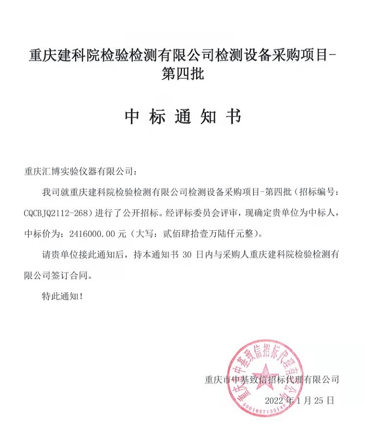 重慶建科院檢驗(yàn)檢測(cè)有限公司委托重慶市中基致信招標(biāo)代理有限公司對(duì)我公司檢測(cè)設(shè)備采購(gòu)項(xiàng)目(項(xiàng)目號(hào):CQCBJQ2112-268 )重慶建科院檢驗(yàn)檢測(cè)有限公司檢測(cè)設(shè)備采購(gòu)項(xiàng)目-第四批進(jìn)行了公開招標(biāo)采購(gòu),現(xiàn)已完成全部采購(gòu)程序。確認(rèn)重慶匯博實(shí)驗(yàn)儀器設(shè)備有限公司為檢測(cè)設(shè)備采購(gòu)項(xiàng)目-第四批中標(biāo)人,中標(biāo)價(jià)為2416000元(貳佰肆拾壹萬陸仟佰元整)。