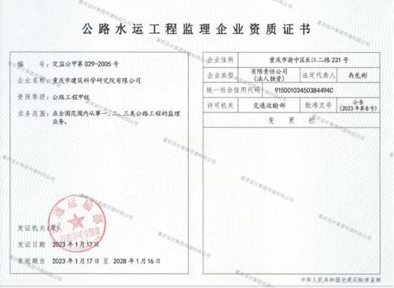 重慶設計集團市建科院公司公路水運工程監(jiān)理甲級資質(zhì)順利通過重新核定