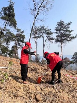 此次植樹點(diǎn)位于縉云山歇馬街道“8.21”山火發(fā)生地,2022年,重慶歷經(jīng)“8.21”山火考驗(yàn),需通過人工造林對受災(zāi)區(qū)域進(jìn)行修復(fù)。半年后,春風(fēng)又綠縉云山,伴隨驕陽,第一黨支部全體黨員同志們身穿紅馬甲,頭戴“小紅帽”,到達(dá)植樹點(diǎn)后揮鍬挖土、扶正樹苗、填土夯苗、堆砌圍堰、澆水灌溉......接連種下一棵棵木荷樹、楓香樹。現(xiàn)場一片繁忙景象,其樂融融、氣氛熱烈。