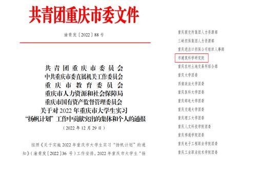近日,市委直屬機關(guān)工委、市教委、市人力社保局、市國資委、團市委對在 2022 年重慶市大學生實習“揚帆計劃”工作中做出突出貢獻的 97 個組織、 95 名工作者以及表現(xiàn)出色的220 名優(yōu)秀學生進行了通報。其中,重慶市建筑科學研究院有限公司(以下簡稱公司)獲得貢獻突出組織稱號,公司黨委辦公室實習學生程慶(重慶交通大學)獲得表現(xiàn)出色個人稱號。