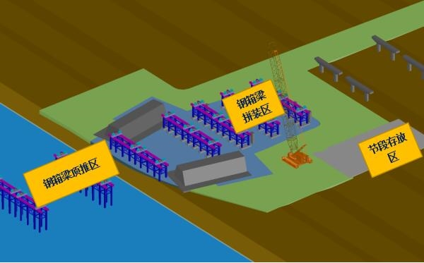 為避免河道水資源污染,確保航道通暢,箱梁采用整節(jié)段拼裝、頂推施工工藝。主橋鋼結(jié)構(gòu)現(xiàn)場(chǎng)施工分為鋼箱梁頂推和拱肋吊裝兩部分,鋼箱梁塊段運(yùn)輸至現(xiàn)場(chǎng)的拼裝支架上組拼成大塊段節(jié)段,焊接完成整體后進(jìn)行頂推施工(鋼箱梁頂推施工期間, 18#、21#墩引橋側(cè)高蓋梁暫不施工,主橋側(cè)支座墊石正常施工),依次循環(huán),直至鋼箱梁全部頂推完成。拱肋放置于鋼箱梁對(duì)應(yīng)位置一同頂推到位,鋼箱梁整體落梁至頂推臨時(shí)支架上,2臺(tái)400t履帶吊上橋進(jìn)行拱肋支架安裝和拱肋安裝。過(guò)程中通過(guò)整體頂推設(shè)備控制程序自動(dòng)調(diào)節(jié),確保設(shè)備的協(xié)調(diào)同步。