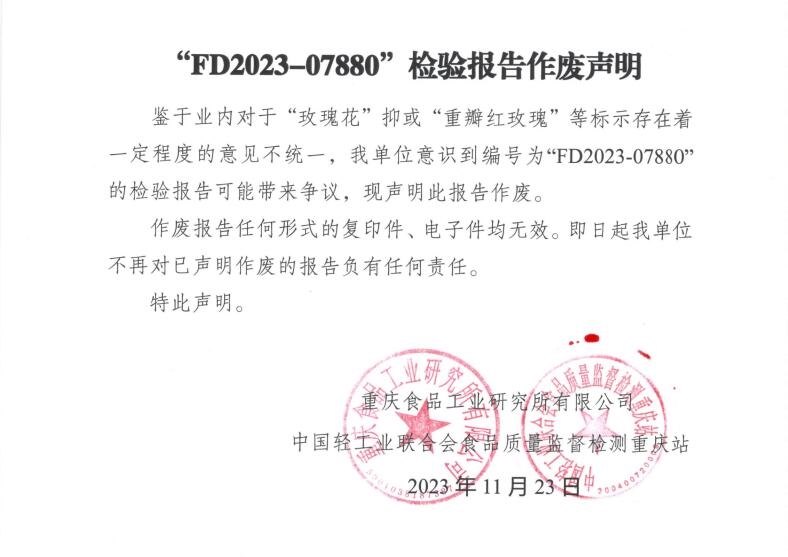 鑒于業(yè)內(nèi)對(duì)于“玫瑰花”抑或“重瓣紅玫瑰”等標(biāo)示存在著一定程度的意見不統(tǒng)一,我單位意識(shí)到編號(hào)為“FD2023-07880”的檢驗(yàn)報(bào)告可能帶來爭(zhēng)議,現(xiàn)聲明此報(bào)告作廢。