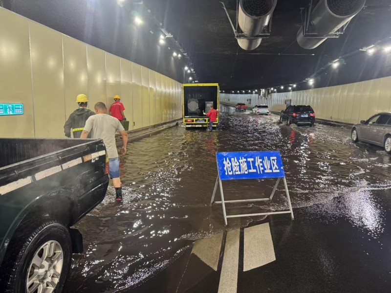 某區某隧道因地勢低洼且缺乏沉砂池,暴雨導致隧道中段嚴重積水,交通中斷。市建科院應急隊伍火速趕赴現場,會同市政管網管理及設施維護單位,徹夜奮戰,采取緊急排水措施,全力保障隧道通行安全及結構穩定。