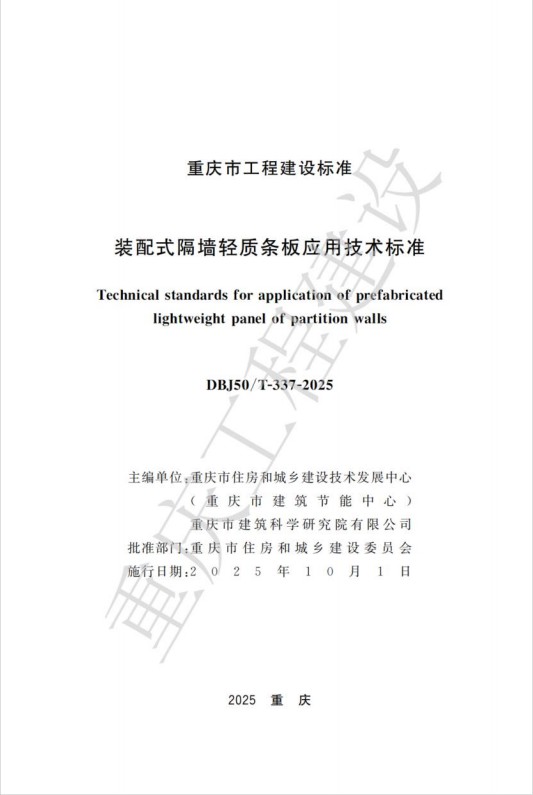 近日,由重慶設(shè)計集團所屬子企業(yè)重慶市建筑科學研究院有限公司(以下簡稱“市建科院”)聯(lián)合重慶市住房和城鄉(xiāng)建設(shè)技術(shù)發(fā)展中心編制的重慶市工程建設(shè)標準《裝配式隔墻輕質(zhì)條板應用技術(shù)標準》(DBJ50/T-337-2025)通過了重慶市住房和城鄉(xiāng)建設(shè)委員會的審批并發(fā)布,將于2025年10月1日起開始實施。